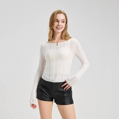 Women Crew Neck Long Sleeve Crochet Crop Top Hollow Out Knit Pullover Casual Beach Cover Up