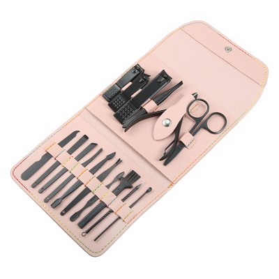 Unique Bargains Stainless Steel Pedicure Nail Clippers Scissors Tool Set Black with Gray PU Leather Black 16Pcs
