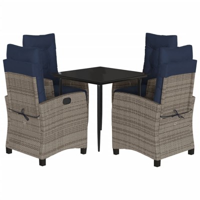vidaXL 5-Piece Patio Dining/Lounging Set - Gray Poly Rattan with Navy Cushions, Adjustable Reclining Chairs, Tempered Glass Top Table