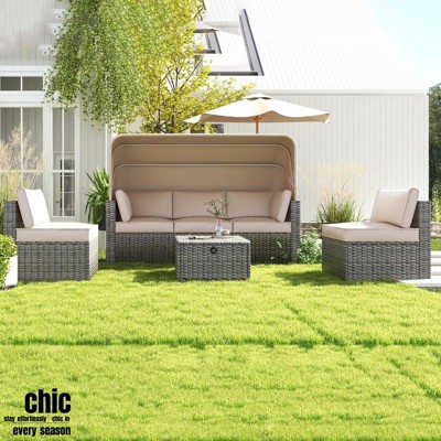 Jojoka 6PC Patio Furniture Set with Adjustable Canopy & Backrest, Rattan Outdoor Sectional Conversation Sofa for Yard Garden Deck