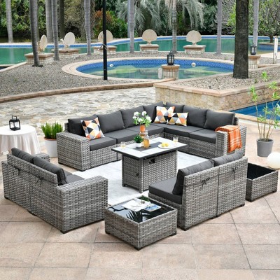 Ovios Tenaya 10pc Wicker Outdoor Patio Furniture Set Conversation Sofa with a Storage Fire Pit, Swivel Chairs and Cushions