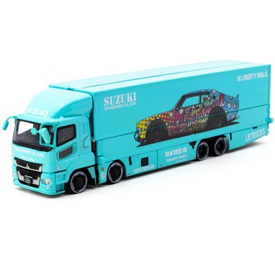 Mitsubishi Fuso Truck with Transporter Light Blue with Graphics 1/64 Diecast Model Car by Tarmac Works