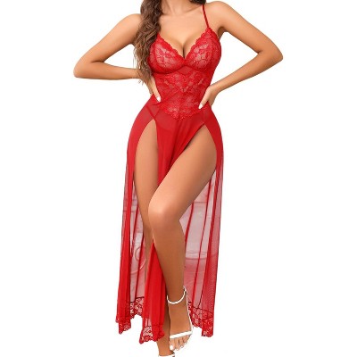 Avidlove Women Lingerie Dress Long Lace Babydoll Chemise Side Split Night Gowns V Neck Mesh Nightdress True Red XXL
