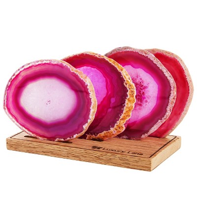 Luxury Lane Set of 4 Large Natural Brazilian Agate Slice Geode Rock Stone Drink Coasters with Wood Holder