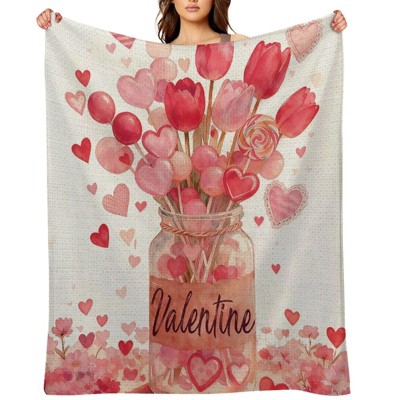 Valentine's Day Fleece Blanket Ultra Soft Anti-Pilling Floral Heart Welcome Print for Couch Bed Camping 30x40 inches