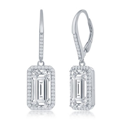 Simona Sterling Silver, Emerald-Cut 5x7 Blue Topaz, White Topaz Border, Dangle Earrings - Blue
