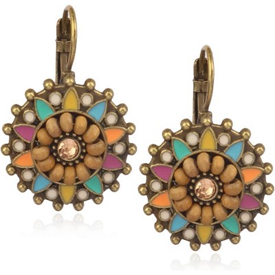 Bohemian Round Flower Dangle Earrings, Sparkling Crystal & Beaded Bronze Retro Leverback Design