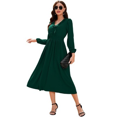 INSPIRE CHIC Women's V Neck Lantern Sleeve Ruffle Flowy A-Line Elegant Midi Dress