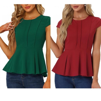 INSPIRE CHIC Women's Elegant Round Neck Cap Sleeve Solid Color Peplum Blouses 2 Packs