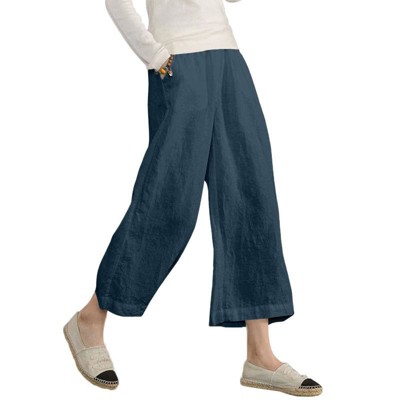 ECUPPER Womens Linen Cropped Pants Loose Casual Capri Cotton Wide Leg Plus Size Elastic Waist with Drawstring Trouses