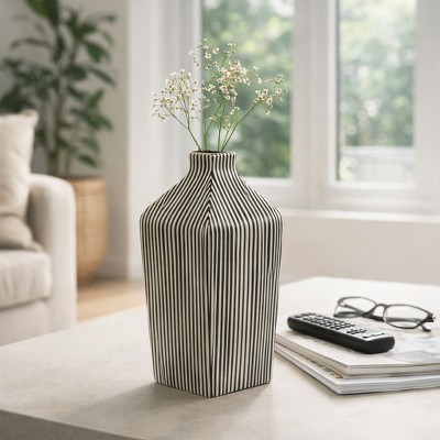 Striped Geometric Ceramic Flower Vase for Table Display and Home Decor - Tall Vase Accent for Shelves and Centerpieces - Black, 11"