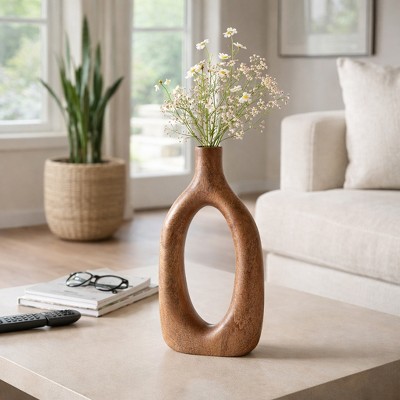 Open Center Sculptural Mango Wood Flower Vase for Centerpieces and Shelves - Tall Vase Accent for Home Decor and Table Display - Brown, 14"