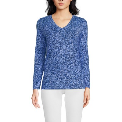 Lands' End Women's Petite Relaxed Supima Cotton Long Sleeve V-Neck T-Shirt - X-Small - Deep Sea Navy Flowers