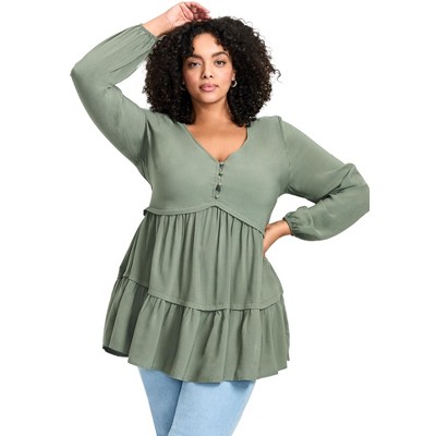 Women's Plus Size Pleated Front Ruffle Sleeve Crew Neck Flowy Summer Casual Babydoll Blouses - GRACE & GRANDEUR