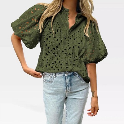 Coolmee Women's Hollow Out Shirts Lantern Sleeve V Neck Button Down Blouses Lace Long Sleeve Blouse Shirts Tops