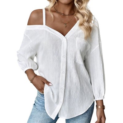INSPIRE CHIC Women's Work Office V Neck Tie Waist Button Decor Long Sleeves Peplum Blouse Top Shirts
