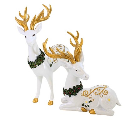 Roman 10.75 In Deer Figurines White Poinsettia Christmas Figurine Set , Christmas Decor Reindeer Elegant (2PC)