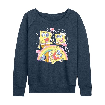 Women's - Spongebob Squarepants - Cute Face Rainbow-Women's French Terry Pullover Lightweight French Terry Wide Neck Long Sleeve Graphic Shirt