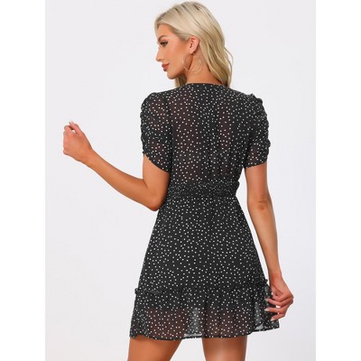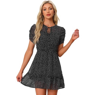 Allegra K Women's Chiffon Ruched Sleeves Bow Tie Keyhole Front Elastic Waist Polka Dots Mini Dress