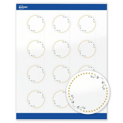 Avery Labels, 2" Diameter, Glossy White, Green Florals w/ Gold Dots, 120ct