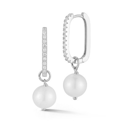 Sphera Milano Sterling Silver Pearl Charm Oval Hoop Earrings