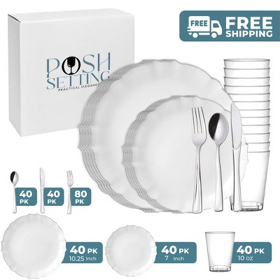 Posh Setting 280 Piece White And Silver Plastic Party Bundle - Luxe (40 Settings)