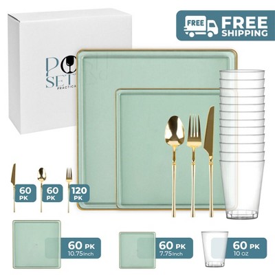 Posh Setting 420 Piece Green And Gold Plastic Party Bundle - Square Edge (60 Settings)