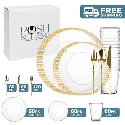 Posh Setting 420 Piece Clear And Gold Plastic Party Bundle - Beaded (60 Settings)