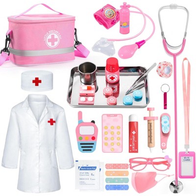 Etokfoks Kids Doctor Kit 21 Piece Medical Pretend Play Set with Costume Bag and Rolling Cart for Toddlers Age 3 4 5 Girls Boys Pink