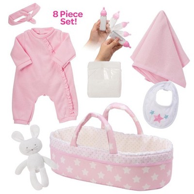 LullaBaby Doll Clip-On Table Seat and Accessories Set: Fits 14" Doll, Includes Play Food, Baby Theme, 12 Pieces