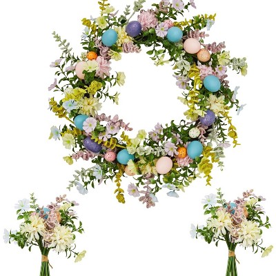 Spring Wreath 2 Matching Bouquets Artificial Flowers & Easter Eggs Lush Greenery Natural Rattan Base Easter Decor for Front Door