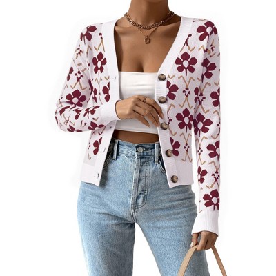INSPIRE CHIC Women's Floral Print V Neck Button Down Long Sleeve Knit Sweater