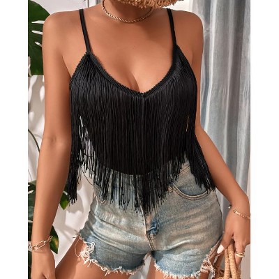 Womens V Neck Sleeveless Fringe Adjustable Spaghetti Straps Slim Fit Casual Camisole Top