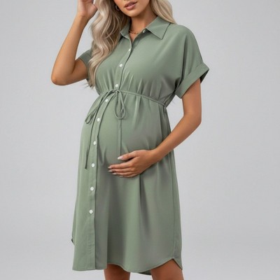 Anna-Kaci Women's Maternity Button Down Shirt Dress with Short Sleeves Adjustable Tie Waist Collared Midi Dress