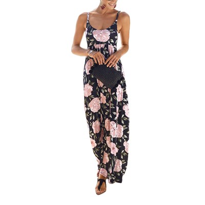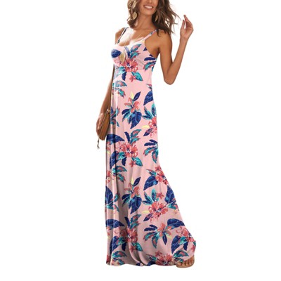 Women's Long Dresses Flower Printed Spaghetti Strap Backless Slim Fit Dress