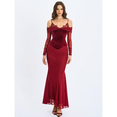 Miss Circle Maybelle Magenta Bardot Lace Strap Peplum Maxi Dress