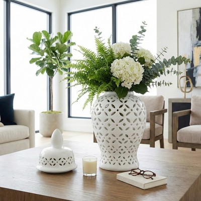 Ceramic Vase - Floral Embossed Ceramic, Boho Glam Decorative Accent for Home, Office, Bedroom, Living Room - Elegant Modern Flower Design - 11" White