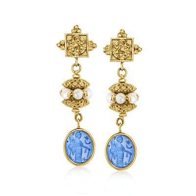 Ross-Simons Italian Tagliamonte Blue Venetian Glass and 4-4.5mm Cultured Pearl Drop Earrings in 18kt Gold Over Sterling