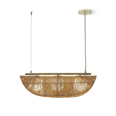VidaLite Sovev 3-Light Linear Pendant: Adjustable Brass & Rattan, Dimmable, Rustic Bohemian Style, Hardwired Installation