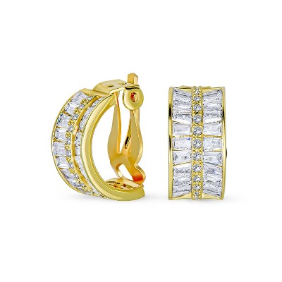 Bling Jewelry Art Deco Style Statement CZ Half Hoop Baguette Earrings Clip On Yellow Gold Plated