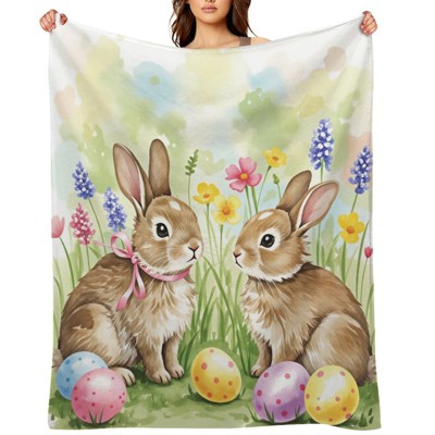 Easter Throw Blanket, Watercolor Easter Bunnies in Flower Flannel Throw Blankets, Spring Holiday Throws All Season Use 50x60 inches