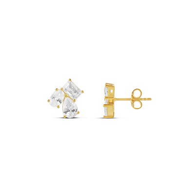 Multi Shape 3 Stone Stud Earrings — .925 Sterling Silver, 14K Gold-Plated, Pink Cubic Zirconia Detailing