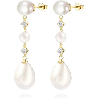 Pearl Earrings for Women 14K Gold Plated/925 Sterling Silver Double Pearl Dangle Drop Earrings for Bridal Wedding