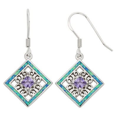 Opalata Sterling Silver Blue Inlay Opal Open Square with Center Square Purple CZ Earrings - Blue
