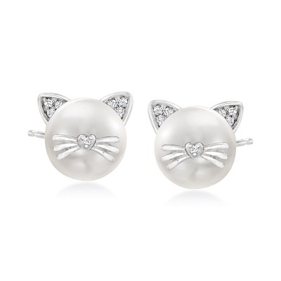 Ross-Simons 8-8.5mm Cultured Pearl Cat Earrings With Diamonds in Sterling Silver