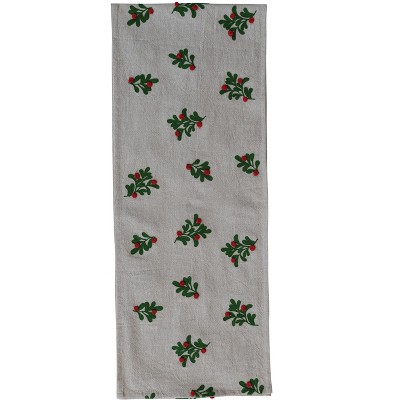 Storied Home Cotton and Linen Table Runner with Embroidered Mistletoe and Pom Poms, Natural, Green and Red