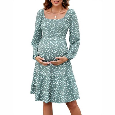 Womens Maternity Dress Shirred Square Neck Fit and Flared Dress Long Sleeve Maternity Dress Flounce Hem Tiered Midi Dress