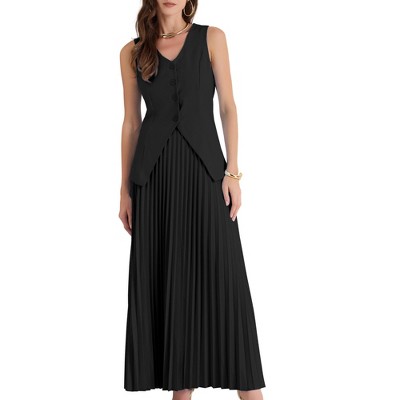 INSPIRE CHIC Women's Summer Outfits V Neck Sleeveless Button Vest Maxi Pleated Skirts Set 2 Pieces