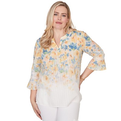 Alfred Dunner Womens Falling Floral Three Quarter Sleeve Top, Yellow Multi, Size XL