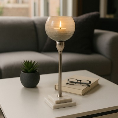 Decorative Glass Candle Holder with Marble Stand - Elegant Candle Stick Holder for Mantel or Entryway Decor - Table and Home Accents - Silver
